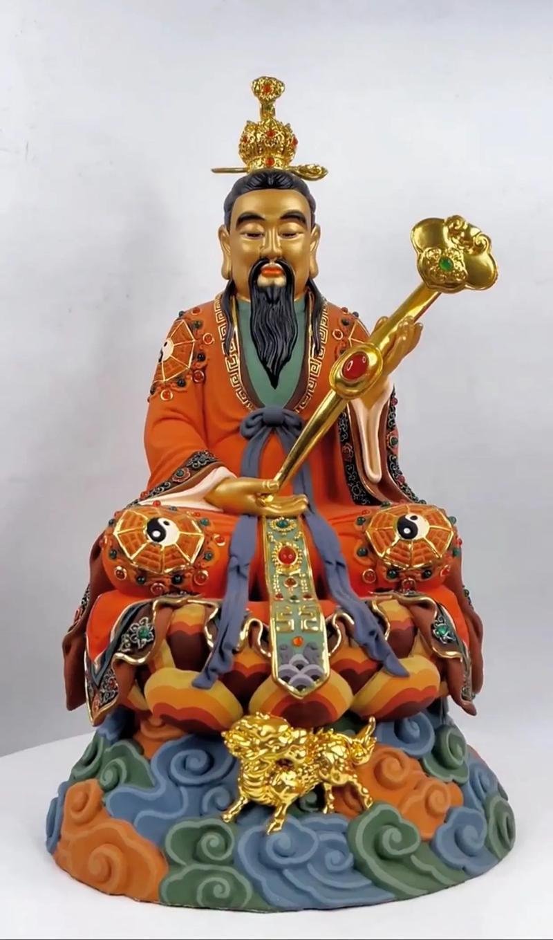 Lingbao Tianzun is typically portrayed as a majestic, middle-aged deity, often holding a Ruyi scepter (a symbol of authority and the fulfillment of wishes) or a Lingbao Pearl. He resides in the “Upper Pure Realm” (Shangqing Jing). His iconography is less defined than that of Taishang Laojun, reflecting his more abstract role, but he is always shown with the regalia of a celestial sovereign.